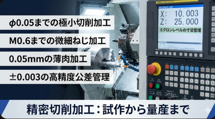 NC旋盤を使用して、丸棒や六角材を削り出し、ミクロンレベルの寸法管理と高い精度を実現いたします。複雑な形状や厳しい公差要求にも対応し、安定した品質を提供いたします。試作から量産まで一貫した対応が可能です。